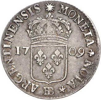 Los-Nummer: Auktion 51 - 2988 Ausländische Münzen und Medaillen Frankreich Ludwig XIV. 1643-1715, 1/2 Ecu 1709 BB, Straßburg. Gadoury 200. Justiert, sehr schön Schätzpreis: 100,- Zuschlag: unverkauft |