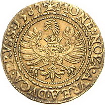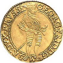 Los-Nummer: Auktion 51 - 1427 Altdeutsche Münzen und Medaillen Preußen, Herzogtum (Ostpreußen) Georg Friedrich als Administrator 1578-1603, Dukat 1587, Königsberg. Stehender Herrscher / Adler mit S auf der Brust. Neumann 54, v. Schrötter 1242 ff, Friedberg 315. GOLD. Sehr schön - vorzüglich Schätzpreis: 900,- Zuschlag: 1300,- |