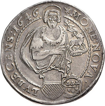 Los-Nummer: Auktion 51 - 1010 Altdeutsche Münzen und Medaillen Lübeck, Stadt Taler 1646. St. Johannes mit Lamm vor Stadtschild, unten Wappen des Bürgermeisters Christian Gerdes. Behrens 174, Davenport 5451. Äußerst selten. Sehr schön + Schätzpreis: 1250,- Zuschlag: unverkauft |