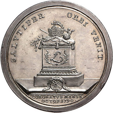 Los-Nummer: Auktion 51 - 1285 Altdeutsche Münzen und Medaillen Nürnberg, Stadt Medaillen, Medaille 1790, von Werner. Geschenkmedaille der Stadt, anlässlich der Kaiserwahl Leopolds. Belorbeertes Brustbild nach rechts / Krönungsinsignien auf Altar, am Fuß Stadtwappen. Slg. Erlanger 1167 , J.u.F. 929, Förschner 396. 45,5 mm, 28,20 g. Prachtexemplar. Fast Stempelglanz Schätzpreis: 1250,- Zuschlag: unverkauft |