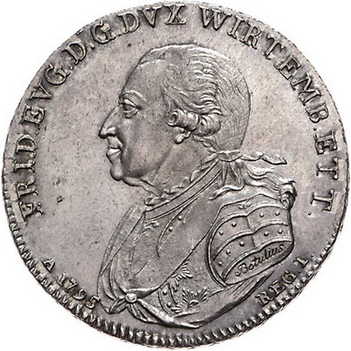 Los-Nummer: Auktion 51 - 1892 Altdeutsche Münzen und Medaillen Württemberg Friedrich Eugen 1795-1797, Taler 1795. Auf das 300jährige Bestehen des Herzogtums. Brustbild nach links / Unter strahlender Krone das mit Ordenskette behangene Wappen. Klein/Raff 460, Davenport 2873. Vorzüglich - Stempelglanz Schätzpreis: 1500,- Zuschlag: 1200,- |