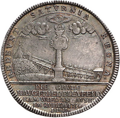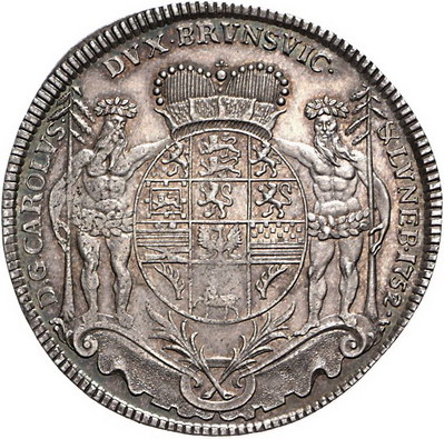Los-Nummer: Auktion 51 - 649 Altdeutsche Münzen und Medaillen Braunschweig-Wolfenbüttel Karl I. 1735-1780, Ausbeutetaler 1752 IBH, Zellerfeld. Ausbeute der Grube 'Herzog Friedrich August Bleyfeld'. Landschaft mit Feldgestänge von einem Gebäude rechts zu Schachtgöpel links, der sich hinter einer Bergehalde befindet, davor Säule mit Fürstenhut zwischen Wolken, darüber das Metallzeichen für Blei / Zwei Wilde Männer halten Wappen unter Fürstenhut. Welter 2725, Davenport 2167, Müseler 10.3/57. Schöne Patina. Leichte Prägeschwäche, winz. Sammlerzeichen, vorzüglich Schätzpreis: 900,- Zuschlag: 800,- |