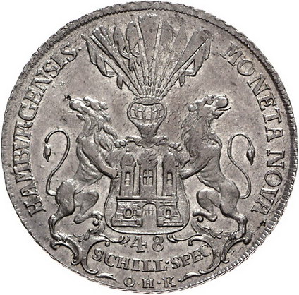 Los-Nummer: Auktion 51 - 875 Altdeutsche Münzen und Medaillen Hamburg-Stadt Taler 1764 OHK. Zwei Löwen halten behelmten Stadtschild, darunter in einer Umrahmung Wert und Stempelschneiderinitialen / Gekrönter Doppeladler. Gaedechens 529, Davenport 2285, Jaeger 58. Winz. Schrötlingsfehler, vorzüglich + Schätzpreis: 400,- Zuschlag: 350,- |