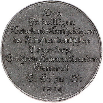 Los-Nummer: Auktion 51 - 1702 Altdeutsche Münzen und Medaillen Sachsen-Coburg-Saalfeld Ernst 1806-1826, Eisengussmedaille 1814. Für die Freiwilligen des 5. deutschen Armeekorps. Lanzenbündel / Schrift. Slg. Julius 3266, Bramsen 1582, Nimmergut 2438. 37 mm. Vorzüglich Schätzpreis: 175,- Zuschlag: unverkauft |