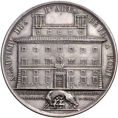 Los-Nummer: Auktion 51 - 3021 Ausländische Münzen und Medaillen Frankreich Medaillen Napoleons I. Medaille 1808, von Tiolier. Auf die französische Akademie der Schönen Künste in Rom. Büste Napoleons nach rechts, daneben Blitzbündel / Ansicht der Villa Medici, darunter Wölfin mit Jungen. Slg. Julius 2017, Bramsen 808. 41 mm, 36,72 g. Sehr selten. Winz. Stempelfehler am Rand, vorzüglich + Schätzpreis: 750,- Zuschlag: unverkauft |
