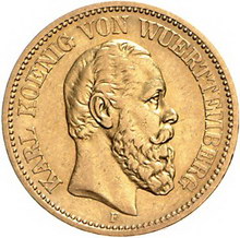 Los-Nummer: Auktion 51 - 2728 Münzen des Deutschen Kaiserreichs Württemberg Karl 1864-1891, 20 Mark 1872 F. Jaeger 290. GOLD. Sehr schön - vorzüglich Schätzpreis: 150,- Zuschlag: unverkauft |