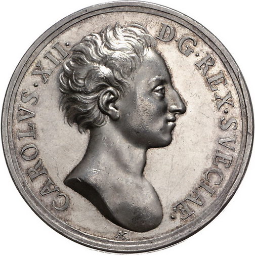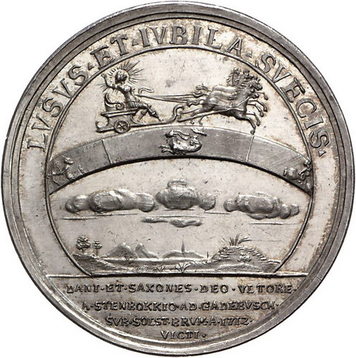 Los-Nummer: Auktion 51 - 1089 Altdeutsche Münzen und Medaillen Mecklenburg-Gadebusch, Stadt Medaille 1712, von Karlsteen und Westman. Auf den Sieg der Schweden über Dänen und Sachsen in der Schlacht bei Gadebusch. Büste des schwedischen Königs Karl XII. nach rechts / Sonnengott in Quadriga über dem Zeichen des Steinbocks, darunter Wolken und Landschaft. Hildebrand 574, 163 Anm., Stenström 128 (Vorderseite). 52 mm, 50,94 g. Äußerst selten. Prachtexemplar. Vorzüglich - Stempelglanz Schätzpreis: 4500,- Zuschlag: unverkauft |