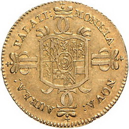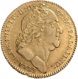 Los-Nummer: Auktion 51 - 956 Altdeutsche Münzen und Medaillen Jülich-Berg Karl Philipp 1716-1742, Carolin 1733, Düsseldorf. Noss 932 var, Friedberg 1411. GOLD. Kl. Randfehler, sehr schön - vorzüglich Schätzpreis: 1000,- Zuschlag: 850,- |