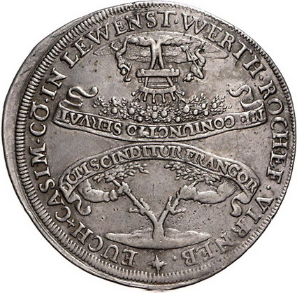 Los-Nummer: Auktion 51 - 1001 Altdeutsche Münzen und Medaillen Löwenstein-Wertheim-Virneburg Eucharius Casimir 1681-1698, Taler 1697, Wertheim. Sog. 'Versöhnungstaler'. Auf die Beendigung der Erbstreitigkeiten. Im unteren Feld zwei Arbeiter und durch Grafenkrone und Reif zusammengehaltener, gespaltener Baum, der reiche Früchte trägt, spiegelverkehrt in der oberen Hälfte von zwei Armen auseinander gerissener verdorrter Baum, auf jeder Hälfte eine Grafenkrone / Behelmtes Wappen. Wibel 107, Davenport 6908. #0106} Kl. Henkelspur, sehr schön Schätzpreis: 750,- Zuschlag: unverkauft |
