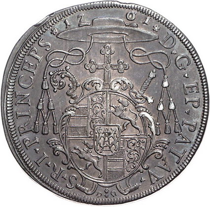 Los-Nummer: Auktion 51 - 1357 Altdeutsche Münzen und Medaillen Passau, Bistum Johann Philipp Graf von Lamberg 1689-1712, Taler 1701, Augsburg. Stempel von P.H. Müller. Kellner 144, Davenport 2517, Forster 424. Winz. Randfehler, sehr schön - vorzüglich Schätzpreis: 350,- Zuschlag: 420,- |