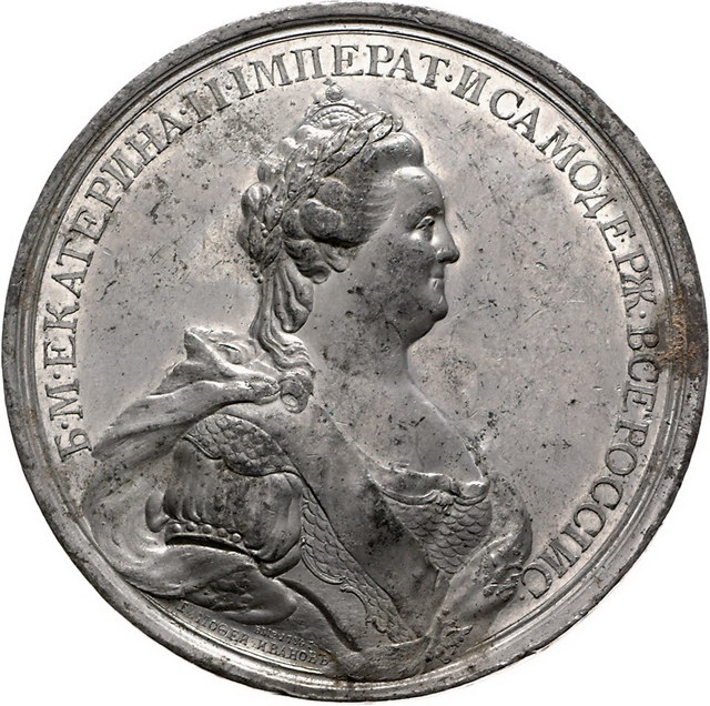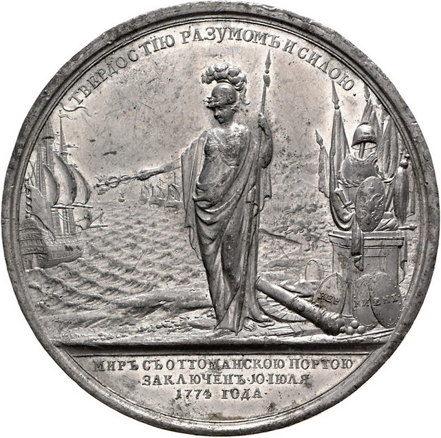 Los-Nummer: Auktion 51 - 3736 Ausländische Münzen und Medaillen Russland Katharina II. 1762-1796, Zinnmedaille 1774, von Ivanov. Auf den Frieden mit der Türkei. Brustbild nach rechts / Pallas Athena mit Lanze und Caduceus auf ein Kriegsschiff zeigend. Diakov 165.3. 66 mm. Sehr schön Schätzpreis: 125,- Zuschlag: 140,- |