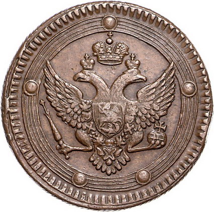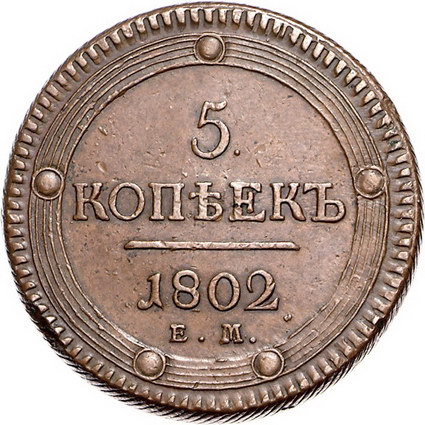 Los-Nummer: Auktion 51 - 3760 Ausländische Münzen und Medaillen Russland Alexander I. 1801-1825, Cu 5 Kopeken 1802, Ekaterinburg. Harris 229, Bitkin 283. Sehr schön - vorzüglich Schätzpreis: 100,- Zuschlag: unverkauft |