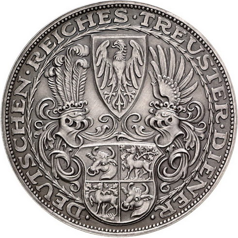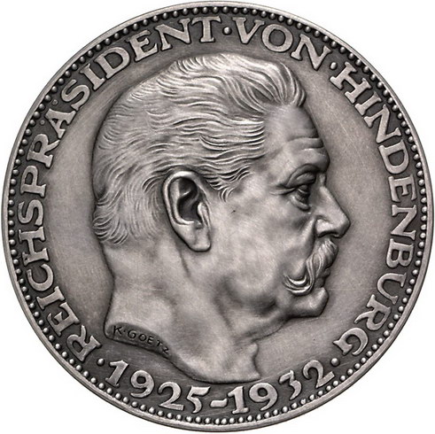 Los-Nummer: Auktion 51 - 2399 Medaillen Münchner Medailleure Goetz, Karl Medaille 1932. Auf den 85. Geburtstag Paul von Hindenburgs. Kopf nach rechts / Behelmtes Wappen. Kienast 475. 60 mm, 59,30 g. Mattiert. Vorzüglich Schätzpreis: 100,- Zuschlag: 160,- |