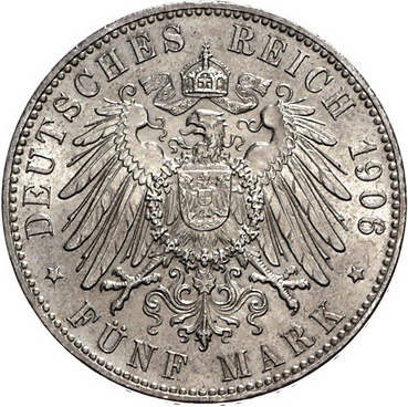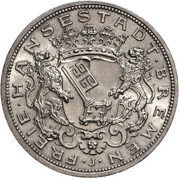 Los-Nummer: Auktion 51 - 2607 Münzen des Deutschen Kaiserreichs Bremen 5 Mark 1906 J. Jaeger 60. Vorzüglich + Schätzpreis: 225,- Zuschlag: unverkauft |