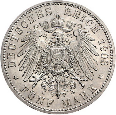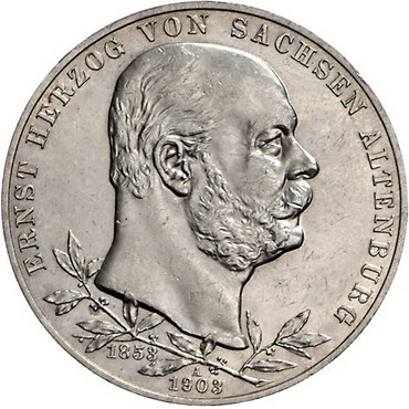 Los-Nummer: Auktion 51 - 2695 Münzen des Deutschen Kaiserreichs Sachsen-Altenburg Ernst 1893-1908, 5 Mark 1903 A. Regierungsjubiläum. Jaeger 144. Vorzüglich + Schätzpreis: 200,- Zuschlag: unverkauft |