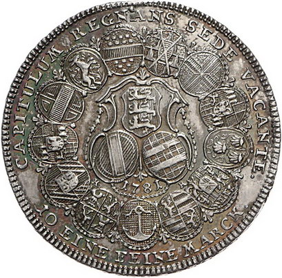 Los-Nummer: Auktion 51 - 758 Altdeutsche Münzen und Medaillen Eichstätt, Bistum Sedisvakanz 1781, Taler 1781, Nürnberg. Cahn 145, Davenport 2210. Henkelspur. Vorzüglich Schätzpreis: 75,- Zuschlag: 170,- |