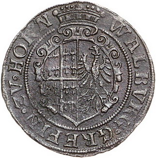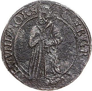 Los-Nummer: Auktion 51 - 1101 Altdeutsche Münzen und Medaillen Mörs, Grafschaft Haus Neuenahr. Walburga 1578-1600, Cu Rechenpfennig o.J. mit Titel Gräfin zu Horn. Stehender St. Antonius / Gekröntes und verziertes Wappen. Äußerst selten. Korrodiert, schön / sehr schön Schätzpreis: 150,- Zuschlag: 190,- |