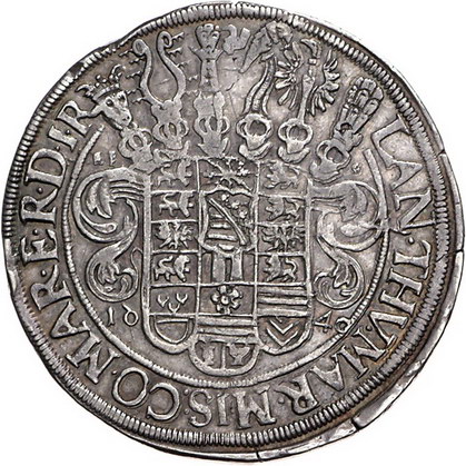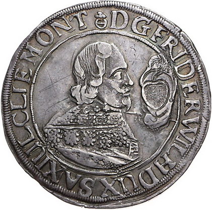 Los-Nummer: Auktion 51 - 1645 Altdeutsche Münzen und Medaillen Sachsen-Coburg-Eisenach (Alt-Gotha) Friedrich Wilhelm II. von Sachsen-Altenburg 1639-1669, Taler 1640, Coburg. Brustbild nach rechts vor Helm mit geöffnetem Visier / Sechsfach behelmtes mehrfeldiges Wappen. Kozinowski/Otto/Ruß 389 (dieses Ex.), Grasser 299, Schnee 310, Davenport 7388. Winz. Kratzer, sehr schön Schätzpreis: 500,- Zuschlag: 750,- |