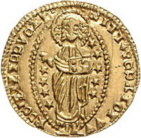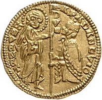 Los-Nummer: Auktion 51 - 18 Kreuzfahrer Achaea Giovanni di Gravina 1347-1368, Ducato, Chiarenza. ARADANDVIO DVX SNVENETI Doge kniet vor St. Markus / Christus in Mandorla, Revers-Legende beginnt: sITTX. Gamberini vgl. 344, Schlumberger vgl. Tf. XII.34, Friedberg 38 a var, Metcalf -. GOLD. Winz. Schrötlingsriss, vorzüglich Schätzpreis: 400,- Zuschlag: 320,- |