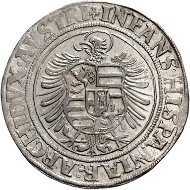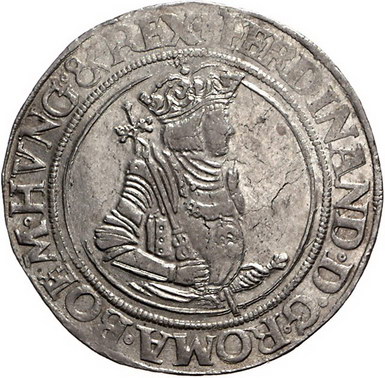 Los-Nummer: Auktion 51 - 1975 Haus Habsburg Haus Habsburg Ferdinand I. 1521-1564, Taler o.J., Joachimsthal. Münzmeisterzeichen Blatt des Martin Kempf (1541-1542). Geharnischtes und gekröntes Hüftbild mit geschultertem Blumenzepter, die Linke am Schwertgriff / Links blickender Adler mit mehrfeldigem Wappenschild auf der Brust. Schulten 3853, Davenport 8039, Voglhuber 40 (Mmz. 7/7), Dietiker 130. Vorzüglich Schätzpreis: 900,- Zuschlag: unverkauft |