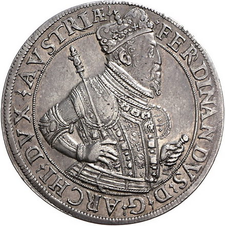 Los-Nummer: Auktion 51 - 1996 Haus Habsburg Haus Habsburg Erzherzog Ferdinand II. 1564-1595, Breiter Doppeltaler o.J., Hall. Geharnischtes Hüftbild mit geschultertem Zepter nach rechts, die Linke hält Kommandostab / Lorbeerbekränzter, gekrönter Tiroler Adler. Davenport 8109, Moser/Tursky 318. Winz. Randkerben, sehr schön - vorzüglich Schätzpreis: 900,- Zuschlag: 1000,- |