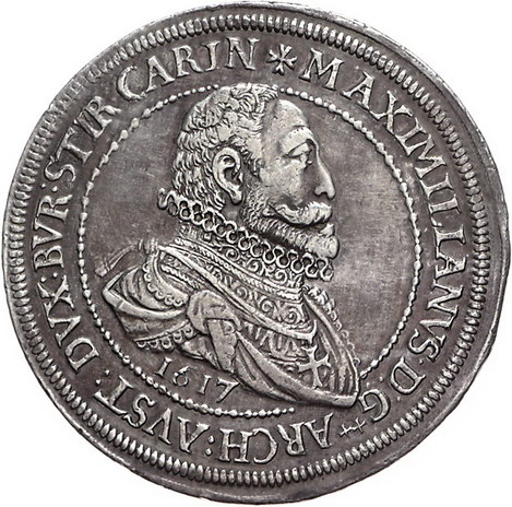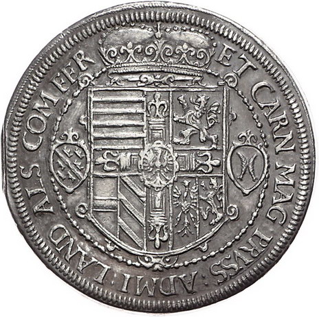 Los-Nummer: Auktion 51 - 2020 Haus Habsburg Haus Habsburg Erzherzog Maximilian 1612-1618, Doppeltaler 1617, Ensisheim. Geharnischtes Brustbild mit Mühlsteinkragen nach rechts / Gekröntes mehrfeldiges Wappen zwischen zwei kleineren ovalen Wappen. Davenport 3325, Moser/Tursky 593. Felder minimal geglättet, fast vorzüglich Schätzpreis: 1500,- Zuschlag: 2600,- |