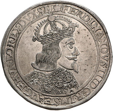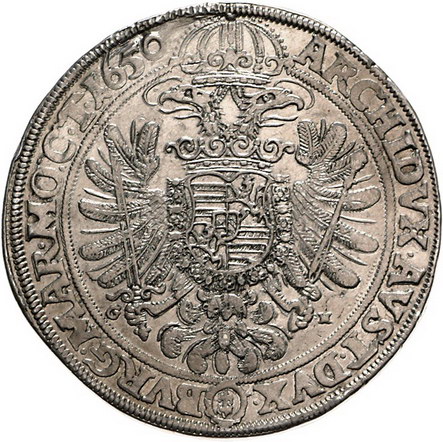 Los-Nummer: Auktion 51 - 2057 Haus Habsburg Haus Habsburg Ferdinand III. 1637-1657, Dicker Doppeltaler 1650, Breslau. Brustbild mit Bügelkrone und Spitzenkragen nach rechts / Gekrönter Doppeladler, auf der Brust vierfeldiges, mit der Ordenskette behängtes Wappen, unten zu den Seiten die Initialen G - H des Münzmeisters Georg Hübner. Herinek 354, Davenport 3218, Fr.u.S. 349. Äußerst selten. Sehr schön / vorzüglich Schätzpreis: 10000,- Zuschlag: 8000,- |