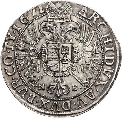 Los-Nummer: Auktion 51 - 2084 Haus Habsburg Haus Habsburg Leopold I. 1657-1705, Taler 1671 NB, Nagybanya. Belorbeertes Brustbild in geistlichem Gewand nach rechts / Gekrönter Doppeladler mit Schwert und Zepter, auf der Brust ungarischer Wappenschild. Herinek 760, Davenport 3272, Huszár 1387. Sehr selten. Winz. Henkelspur, sehr schön - vorzüglich Schätzpreis: 1000,- Zuschlag: 2050,- |