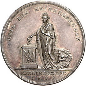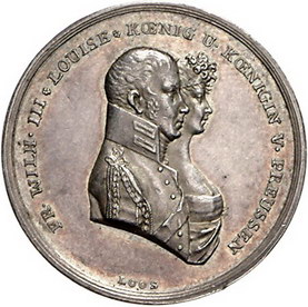 Los-Nummer: Auktion 51 - 535 Altdeutsche Münzen und Medaillen Brandenburg-Preußen Friedrich Wilhelm III. 1797-1840, Medaille 1809, von Loos und Hoffmann. Auf die Rückkehr des Königspaares nach Berlin. Die Brustbilder des königlichen Paares nach rechts / Berolina zwischen Altar und Löwen. Slg. Henckel 2128, Slg. Marienburg 3697, Sommer A 144 , Bolzenthal 53. 28 mm, 4,93 g. Kleine Kratzer, vorzüglich + Schätzpreis: 175,- Zuschlag: unverkauft |