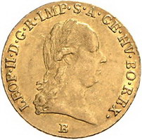 Los-Nummer: Auktion 51 - 2193 Haus Habsburg Haus Habsburg Leopold II. 1790-1792, Dukat 1791 B, Kremnitz. Herinek 5, Jaeger/Jaeckel 82, Friedberg 206. GOLD. Sehr schön - vorzüglich Schätzpreis: 900,- Zuschlag: 800,- |