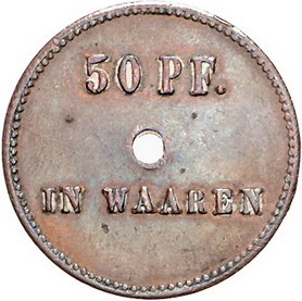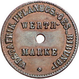 Los-Nummer: Auktion 51 - 2478 Medaillen Kolonien #3Kamerun# Cu Plantagen-Marke o.J. zu 50 Pfennig. Westafrikanische Pflanzungsgesellschaft Bibundi. WESTAFRIK.PFLANZGS.GES."BIBUNDI" im Feld: WERTH./MARKE / Wertangabe in zwei Zeilen. 28,5 mm. Äußerst selten. Originallochung. Vorzüglich Schätzpreis: 500,- Zuschlag: unverkauft |