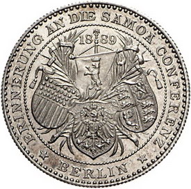 Los-Nummer: Auktion 51 - 2481 Medaillen Kolonien Zweimarkförmige Medaille 1889. Auf die Samoa-Konferenz in Berlin. Kopf Wilhelms II. nach rechts / Die Wappen der beteiligten Staaten USA, Deutsches Reich und Großbritannien neben der Fahne mit dem Berliner Bären. Slg. Grönegreß 1356, Slg. Marienburg 6930. Rand gerippt. 28 mm, 9,42 g. Vorzüglich Schätzpreis: 125,- Zuschlag: 170,- |