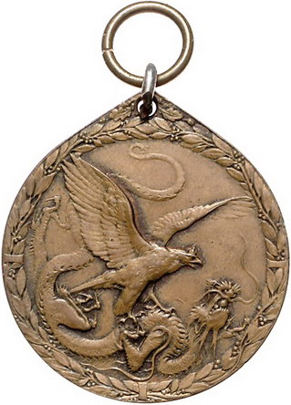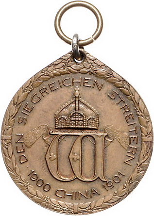 Los-Nummer: Auktion 51 - 2483 Medaillen Kolonien China-Denkmünze#0Medaille# 1901/1902 für Kämpfer. Deutscher Adler tötet den chinesischen Drachen / Gekröntes Monogramm. Slg. Grönegreß 1272 , H.-Schreiber 400, Nimmergut 3150. Bronze. 32,5 mm. Schwarz-weiß-rot-gelbes Band beigefügt. Trageöse. Vorzüglich Schätzpreis: 100,- Zuschlag: 100,- |