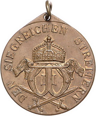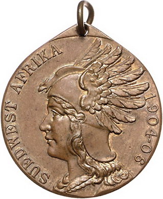 Los-Nummer: Auktion 51 - 2485 Medaillen Kolonien Südwestafrika-Denkmünze#0Medaille# 1904/06 für Kämpfer, von Schultz. Kopf der Germania nach links / Gekröntes Monogramm über gekreuzten Schwertern. Slg. Grönegreß 1283 , H.-Schreiber 402, Klenau 3110. Bronze vergoldet. Dazu die Miniatur dieser Medaille. Schwarz-weiß-rotes Band lose beigefügt. 32,5 mm. 2 Stück. Vorzüglich Schätzpreis: 75,- Zuschlag: 95,- |