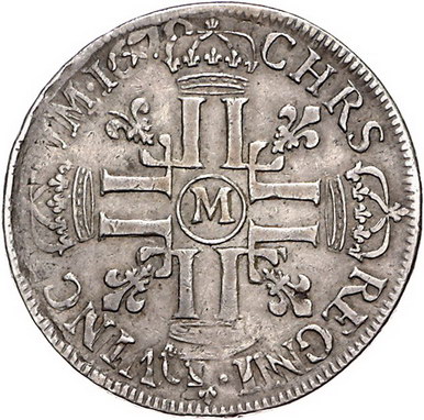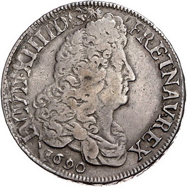 Los-Nummer: Auktion 51 - 2990 Ausländische Münzen und Medaillen Frankreich Ludwig XIV. 1643-1715, Ecu aux huit L 1690 M, Toulouse. Réformation auf einem Ecu 1679. Gadoury 216, Davenport 3811. Sehr schön Schätzpreis: 125,- Zuschlag: 240,- |