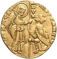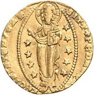Los-Nummer: Auktion 51 - 3258 Ausländische Münzen und Medaillen Italien-Venedig Giovanni Soranzo 1312-1328, Ducato. 3,52 g. IO SVRANTIO DVX Doge kniet vor San Marco / Christus in Mandorla. Gamberini 66, Friedberg 1218, Paolucci S. 26, 1. GOLD. Fast sehr schön Schätzpreis: 200,- Zuschlag: 570,- |