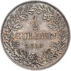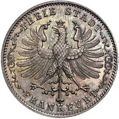Los-Nummer: Auktion 51 - 806 Altdeutsche Münzen und Medaillen Frankfurt, Stadt 1/2 Gulden 1849. Jaeger 26, AKS 16. Schöne Patina. Fast Stempelglanz Schätzpreis: 200,- Zuschlag: 170,- |