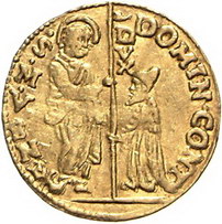 Los-Nummer: Auktion 51 - 3333 Ausländische Münzen und Medaillen Italien-Venedig Domenico Contarini 1659-1675, Zecchino. 3,48 g. DOMIN.CONT DVX. Banner auf Stab ohne Kreuz auf der Spitze. Gamberini 944, Friedberg 1332, Paolucci S. 105, 1. GOLD. Sehr schön Schätzpreis: 175,- Zuschlag: unverkauft |