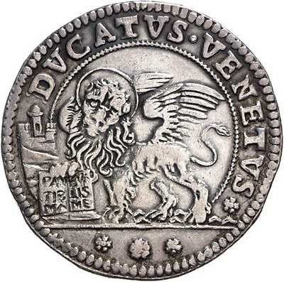Los-Nummer: Auktion 51 - 3338 Ausländische Münzen und Medaillen Italien-Venedig Marc' Antonio Giustinian 1684-1688, Ducato. Münzmeister Antonio Dona. Gamberini 1069, Paolucci S. 109, 9. Kaum sichtbare Henkelspur, sehr schön Schätzpreis: 75,- Zuschlag: unverkauft |