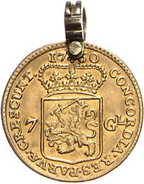 Los-Nummer: Auktion 51 - 3503 Ausländische Münzen und Medaillen Niederlande-Holland, Provinz 7 Gulden 1760. Delmonte 783, Friedberg 254. GOLD. Trageöse, sehr schön - vorzüglich Schätzpreis: 150,- Zuschlag: 160,- |