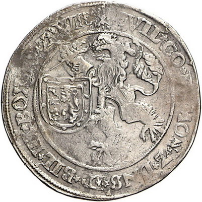 Los-Nummer: Auktion 51 - 3524 Ausländische Münzen und Medaillen Niederlande-S'Heerenberg Wilhelm IV. 1546-1586, Taler o.J. zu 30 Stübern. St. Oswald mit geschlossener Krone. Münzzeichen Zainhaken. Delmonte 575, Davenport 8583. Etwas Fundbelag. Schön - sehr schön Schätzpreis: 125,- Zuschlag: 135,- |