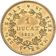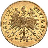 Los-Nummer: Auktion 51 - 814 Altdeutsche Münzen und Medaillen Frankfurt, Stadt Dukat 1853. Adler / Wert in Kranz. Jaeger 53, AKS 1, J.u.F. 71, Divo/Schramm 71, Friedberg 1027. Auflage: 1121 Stück. GOLD. Vorzüglich - Stempelglanz Schätzpreis: 1500,- Zuschlag: 1200,- |