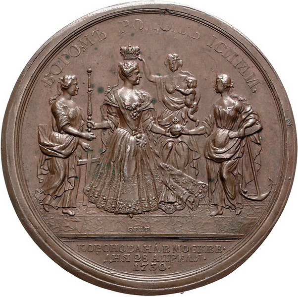 Los-Nummer: Auktion 51 - 3702 Ausländische Münzen und Medaillen Russland Anna Ivanovna 1730-1740, Bronzemedaille 1730, von Judin. Auf ihre Krönung in Moskau am 28.4.1730. Brustbild nach rechts / Die Personifikationen von Glaube, Hoffnung und Liebe überreichen der Zarin die Krönungsinsignien. Zweite Stempelschneidersignatur GFR auf dem Boden. Diakov 69.5. 61,5 mm. Dunkle Patina. Winz. Randfehler, vorzüglich Schätzpreis: 300,- Zuschlag: 800,- |