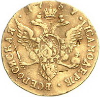 Los-Nummer: Auktion 51 - 3711 Ausländische Münzen und Medaillen Russland Elisabeth I. Petrowna 1741-1761, Dukat 1757, St. Petersburg. Harris 96, Friedberg 113, Bitkin 93. GOLD. Rand bearbeitet, Schlagspuren, schön Schätzpreis: 1500,- Zuschlag: 1200,- |