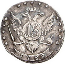 Los-Nummer: Auktion 51 - 3727 Ausländische Münzen und Medaillen Russland Katharina II. 1762-1796, 15 Kopeken 1780, St. Petersburg. Harris 149, Bitkin H 430-432. Sehr selten. Schön - sehr schön Schätzpreis: 250,- Zuschlag: 200,- |