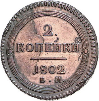 Los-Nummer: Auktion 51 - 3757 Ausländische Münzen und Medaillen Russland Alexander I. 1801-1825, Cu 2 Kopeken 1802 EM, Ekaterinburg. Harris 222. Randfehler, vorzüglich Schätzpreis: 100,- Zuschlag: 110,- |
