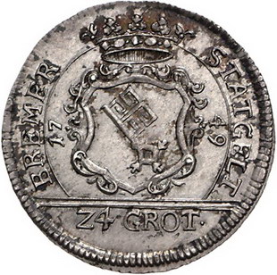 Los-Nummer: Auktion 51 - 704 Altdeutsche Münzen und Medaillen Bremen, Stadt 24 Grote 1749. Gekröntes verziertes, deutsches Wappen mit Bremer Schlüssel, im Abschnitt Wertbezeichnung / Gekrönter Doppeladler mit Zepter, Schwert und Reichsapfel. Jungk 609. Prachtexemplar. Schöne Patina. Vorzüglich - Stempelglanz Schätzpreis: 200,- Zuschlag: 200,- |
