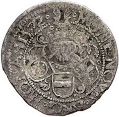 Los-Nummer: Auktion 51 - 1114 Altdeutsche Münzen und Medaillen Münster, Bistum Johann IV. von Hoya 1566-1574, Fürstengroschen (12 Pfennig) 1572. Die behelmten Wappen von Osnabrück, Münster und Paderborn nebeneinander, oben die Hoyaer Bärentatzen / Gekrönter Doppeladler mit Reichapfel auf der Brust, unten der Stiftsschild. Ilisch 33.8 var, Grote 134 de var. Schön - sehr schön Schätzpreis: 200,- Zuschlag: unverkauft |