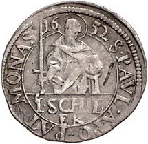 Los-Nummer: Auktion 51 - 1139 Altdeutsche Münzen und Medaillen Münster, Bistum Christoph Bernhard von Galen 1650-1678, Schilling 1652. Schulze 85 c. Schön - sehr schön Schätzpreis: 125,- Zuschlag: 150,- |