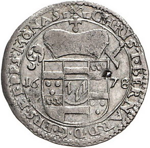 Los-Nummer: Auktion 51 - 1151 Altdeutsche Münzen und Medaillen Münster, Bistum Christoph Bernhard von Galen 1650-1678, 1/8 Taler 1678. Schwert teilt die Umschrift MONA-ST. Schulze 117 a. Prägeschwäche, Schrötlingsfehler, sehr schön Schätzpreis: 75,- Zuschlag: 170,- |